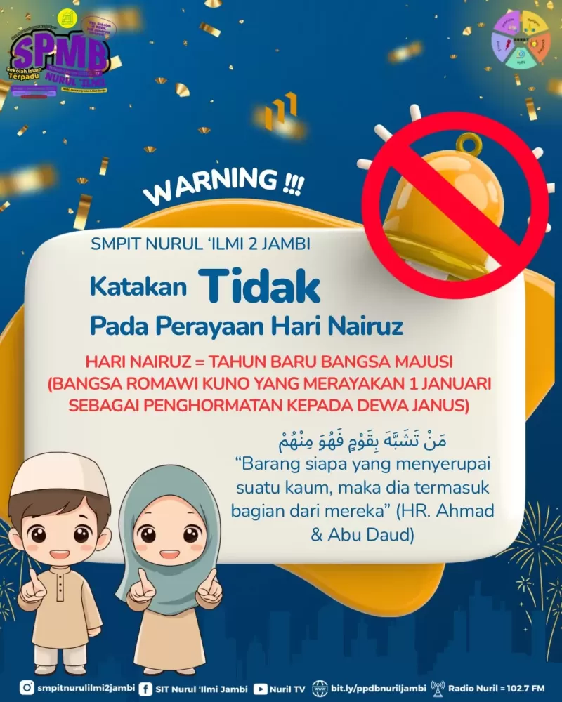 Kepala SMPIT Nurul Ilmi 2 Jambi, Dr. Saiin, M.Pd, mengajak seluruh peserta didik untuk tidak ikut merayakan Tahun Baru Masehi secara euforia, namun menjadikannya momen muhasabah dan penguatan karakter. Sejarah mengajarkan bahwa umat yang kehilangan identitas akan kehilangan segalanya.