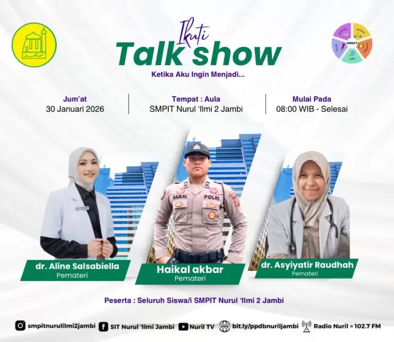 Dalam upaya menumbuhkan semangat belajar, memperluas wawasan, serta membimbing peserta didik mengenali potensi diri sejak dini, SMPIT Nurul Ilmi 2 Jambi menyelenggarakan Talk Show Profesi bertajuk “Ketika Aku Ingin Menjadi…” pada Jum’at, 30 Januari 2026, bertempat di Aula SMPIT Nurul Ilmi 2 Jambi, mulai pukul 08.00 WIB hingga selesai.